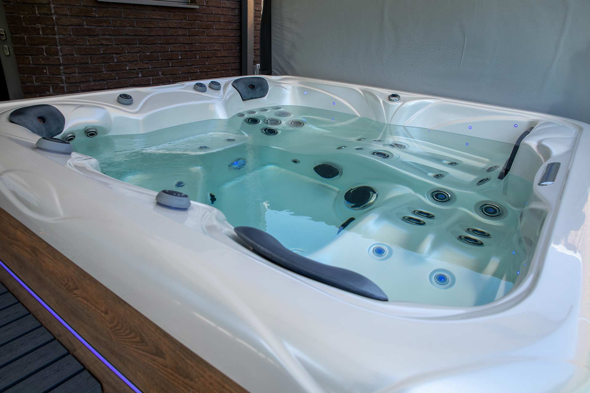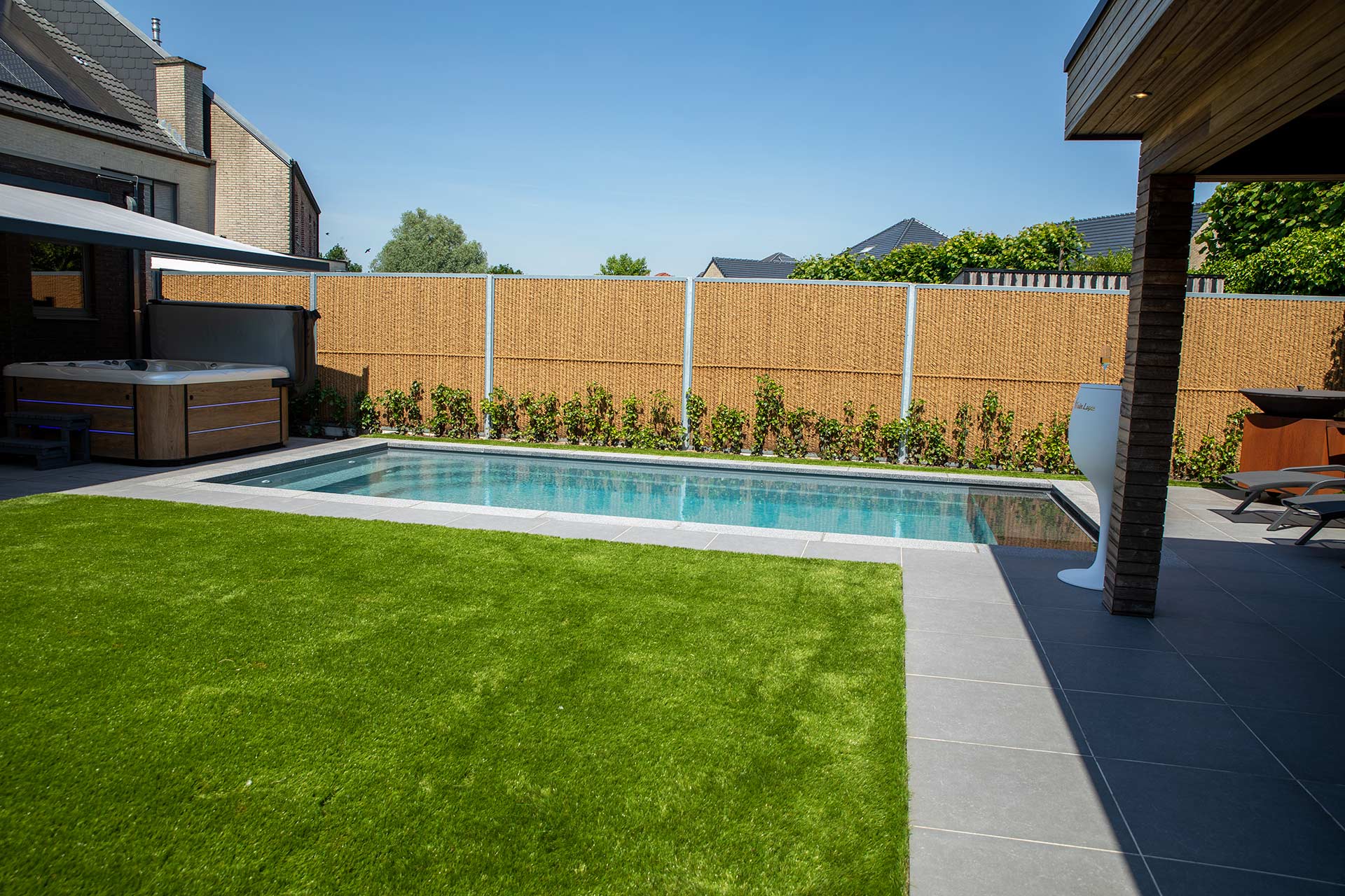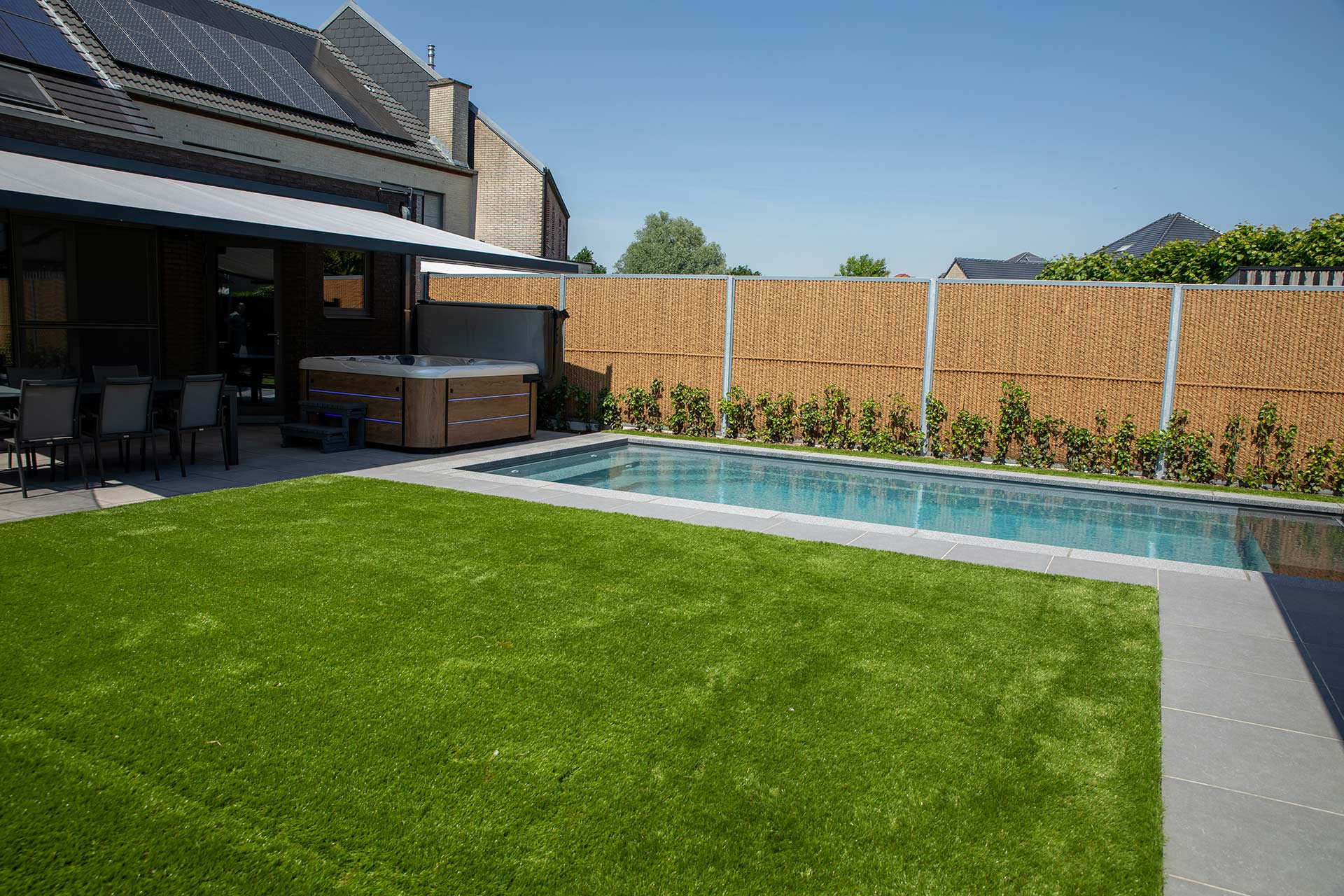 En alsof dat nog niet genoeg is, is er ook nog de verkwikkende spa van het Kos-model. Deze spa biedt ultieme ontspanning en welzijn dankzij de rustgevende massages. Alle zorgen smelten weg in het warme, bruisende water. Het geheel werd prachtig afgewerkt door de keuze voor kunstgras rondom het zwembad en de poolhouse.